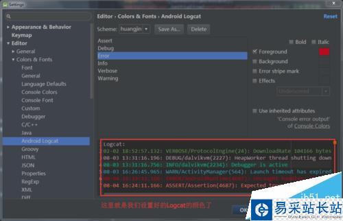 1、打開 android studio2.0 選擇 File--> Editor --> Colors & Fonts --> Android Logcat 就可以看到如左圖的 要把復選框的勾去掉再進行設置顏色