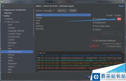 2、把復選框的勾去掉之后我們就可以點擊右邊的前景或背景顏色選框進行設置我們想要的顏色了,設置要和左邊的 Assert、Debug、Error、Info、Verbose、Warning一 一對應起來
