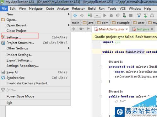 2、進行點擊Android studio的file的菜單之后,就會彈出了一個下拉的菜單選項中進行選擇“setting”的選項。