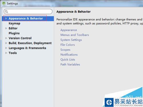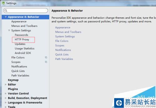 4、點擊“appearance & behavior”完,就會展開進行system setting的選項之后選項內的HTTP proxy的選項。