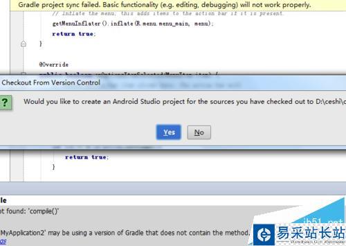 5、彈出checkout from version control的是否使用Android studio打開確認的信息,直接點擊“yes”。