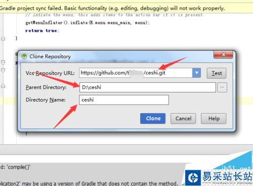4、彈出clone repository框中,parent directory中電腦中保存的路徑地址,而Directory name為保存的文件名。