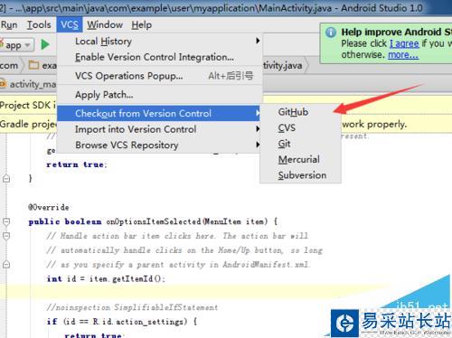 1、首先,需要進入到Android studio的界面中,然后點擊菜單中的"VCS"選項,在彈出的可以看到為“checkout from version control”選項。