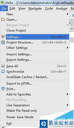 2、選擇Android Studio菜單欄File——Settings選項