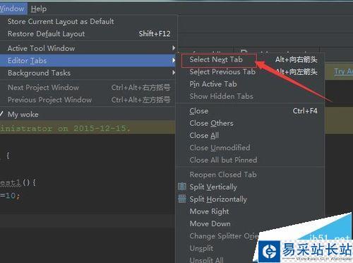5、進行點擊完editor tabs的選項之后,就移動到下一級菜單中的“select next tab”的選項,就會標簽的窗口向前移動。