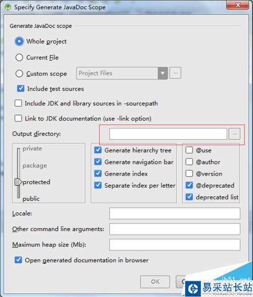 3、就會彈出了specify generate javadoc scope的窗口,在output directorys中進行輸出的路徑。