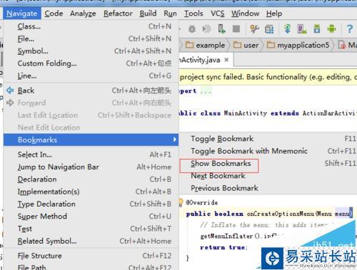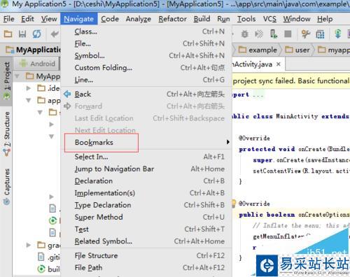 1、在編輯器中已經(jīng)添加了書簽,然后進(jìn)行點(diǎn)擊Android studio中的"navigate"選項(xiàng)菜單。