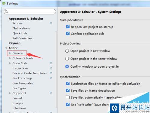4、進(jìn)入到了settings的選項中之后進(jìn)行選擇為editor的選項展開之后,進(jìn)行選擇為general的選項。