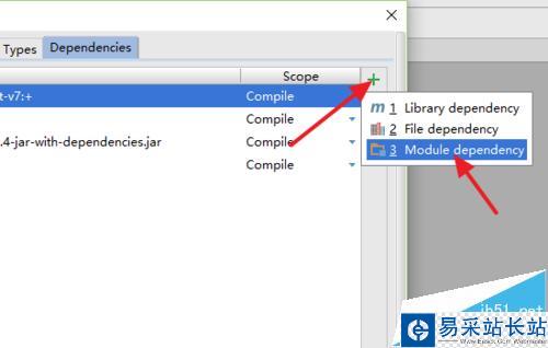 3、點擊右側的“+”添加按鈕,在下拉菜單中找到Module Dependency(項目依賴),點擊打開項目選擇窗口。