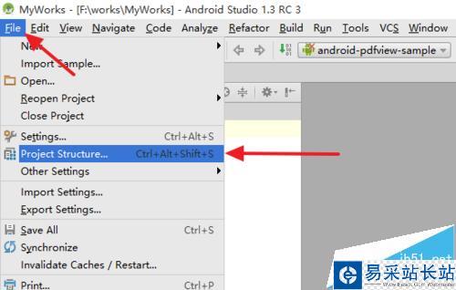 1、啟動AndroidStudio后,打開你需要接收Library的項目。比如有兩個項目,項目A,和Library項目B,那么打開項目A。圖中所示為項目的結構圖,點擊右上角的File菜單。