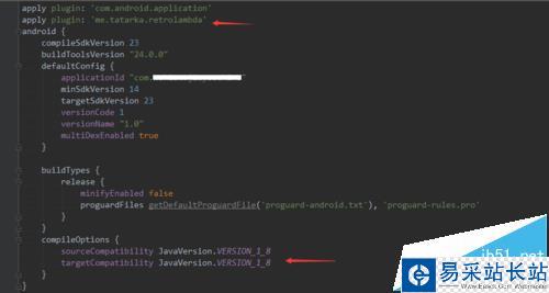 2、Gradle(Module)中添加apply:apply plugin: 'me.tatarka.retrolambda'。Java版本:compileOptions { sourceCompatibility JavaVersion.VERSION_1_8 targetCompatibility JavaVersion.VERSION_1_8}