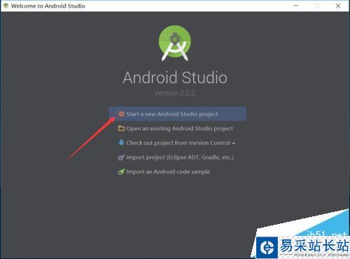 2、我們進行新項目的建立,在起始頁面的窗口中點擊第一個“start a new Android studio project”,開始進行項目的新建操作。