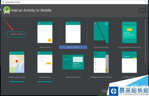 5、完成我們項目的基礎屬性后,我們會進入項目的類型選擇,Android studio給予用戶非常豐富的選擇,第一個“add no activity”,系統不會給予我們原始代碼。