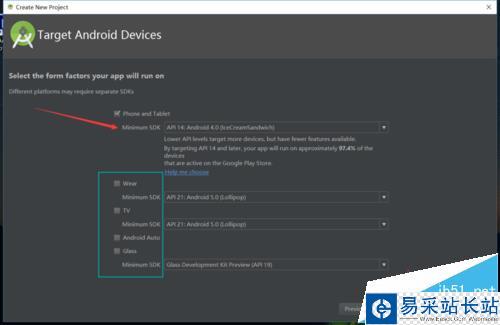 4、完成名稱的設置以及儲存路徑的設置后,點擊“Next”,進入下一步的設置,此窗口為設置我們項目的適用android系統版本,選擇合適的版本后點擊“Next”。