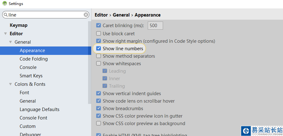 3、在設置頁面左上方的輸入框中輸入“line”,按回車鍵搜索。然后選擇Editor→General→Appearance,選中右邊的Show line numbers