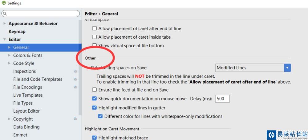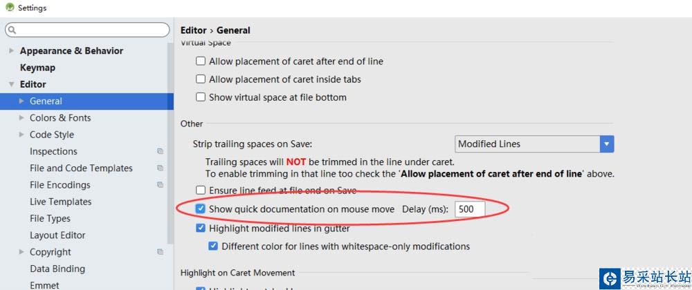 4、選中Other下選項,“Show quick documentation on mouse move”。選項后面還有相應的延遲時間設置,即設置光標移動到代碼上多久后顯示提示框,注意單位是毫秒。