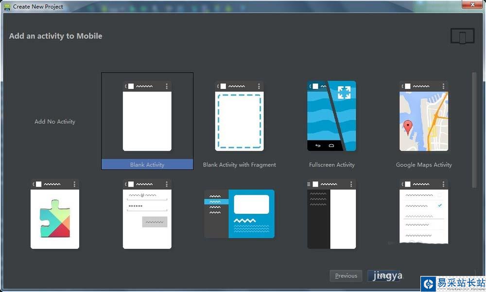 5、確定后最小兼容版本后,選擇項目的活動類型,這里有很多現成的模板可以使用,對于初學者選擇默認的Blank Activity即可。