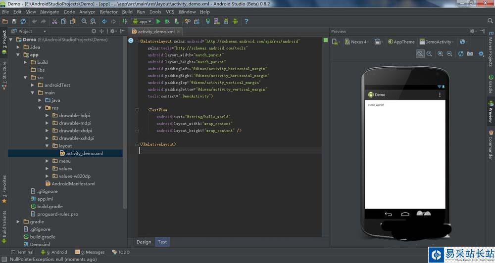 7、創建完后,在項目名-》app-》src-》main-》res-》layout下雙擊xml文件就是打開活動界面設計窗口了。