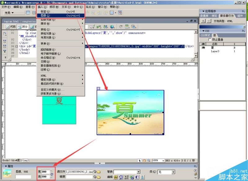 3、在“夏”層里插入一張圖片,大小和“夏”層一樣大,寬和高分成設置為300px、200px;