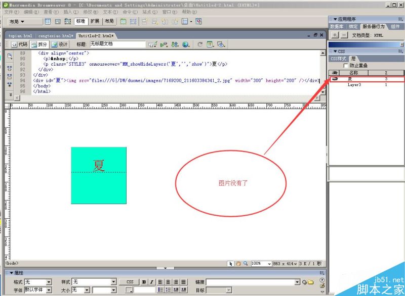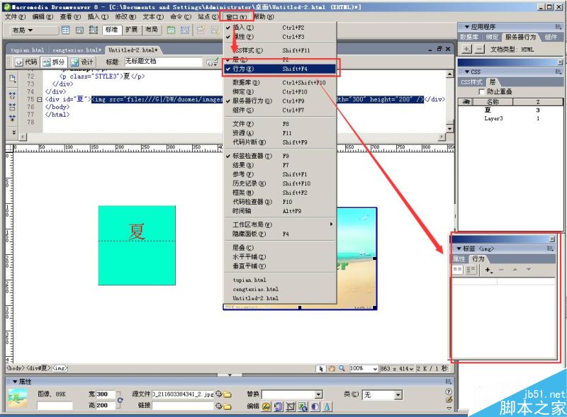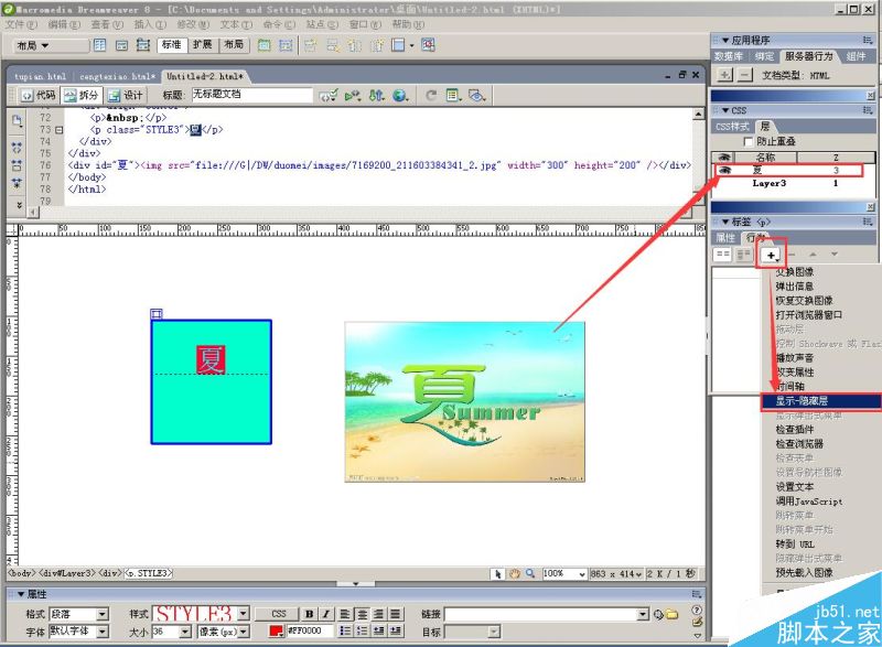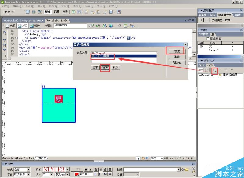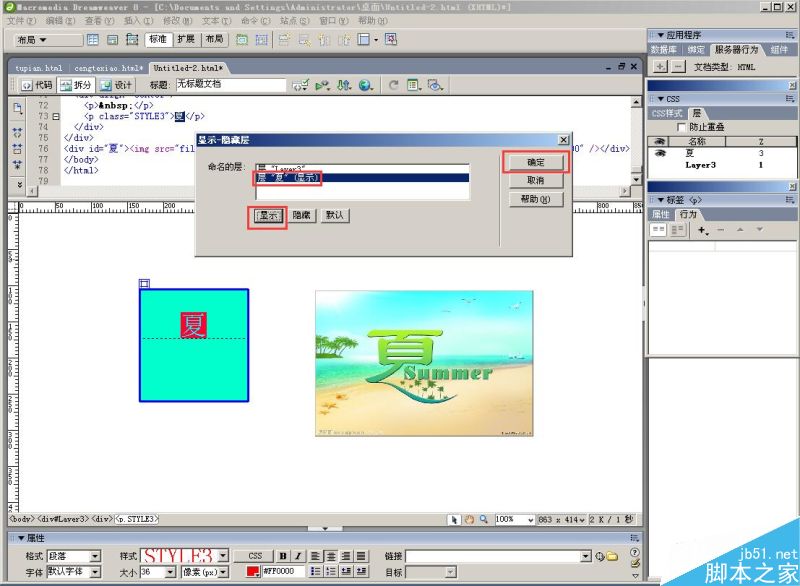 1、新建“HTML文檔”,在“布局”里找到“繪制層”,繪制一個方形層,填充顏色,并在里面輸入文字“夏”,字體和顏色,大家自由設置;