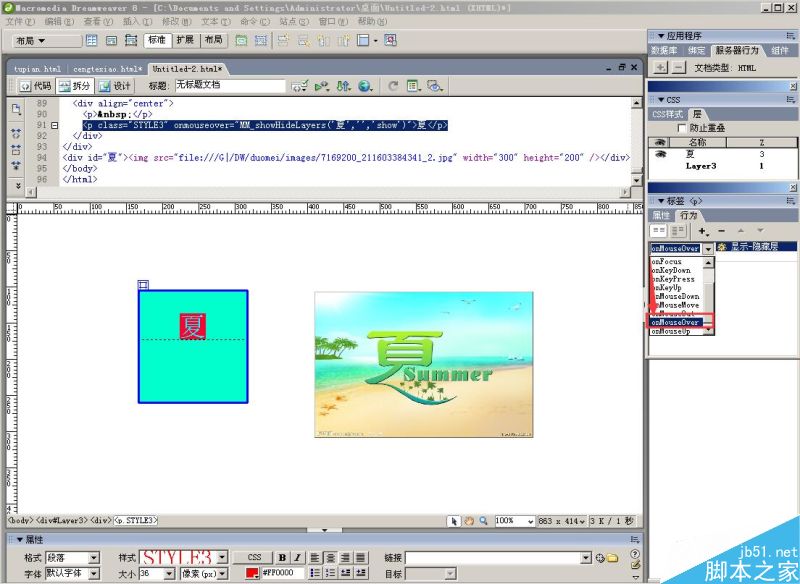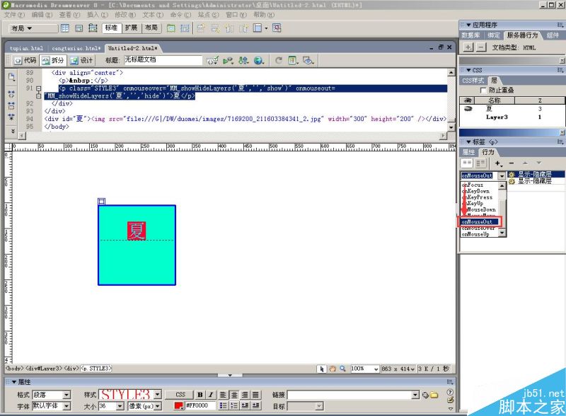 7、在“行為”窗口中,就會出現“顯示—隱藏層”信息,在前面的下拉菜單中選擇“onMouseover ”。