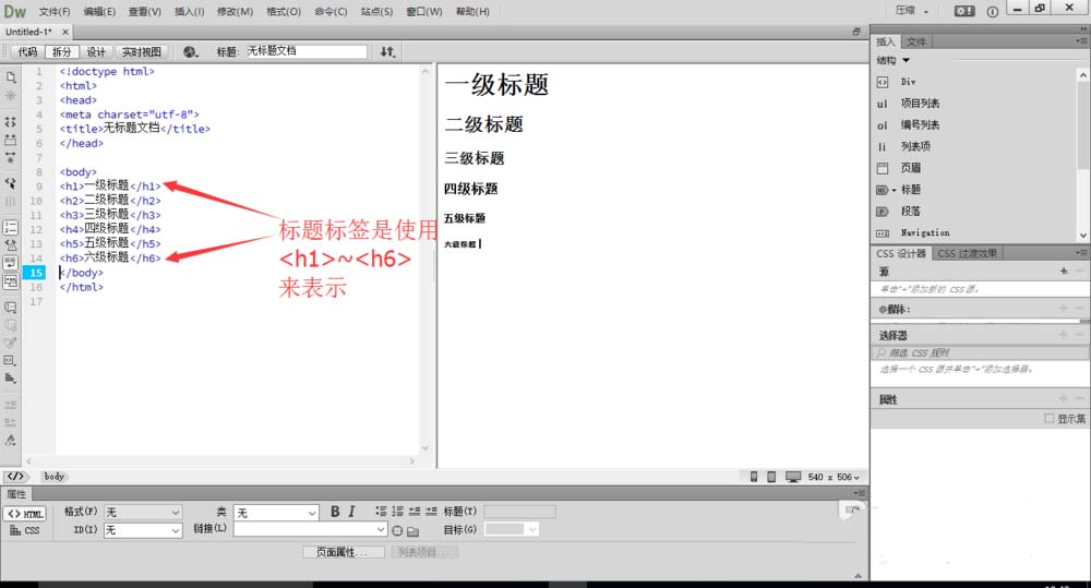 3、標(biāo)題標(biāo)簽是使用<h1>~<h6>來表示,一級標(biāo)題最大。