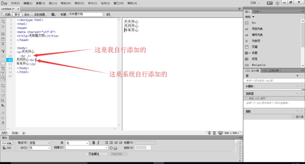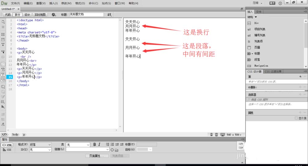 注意:我發(fā)現(xiàn)Dreamweaver CC如此操作的換行標(biāo)簽是<br>,兩者功能一樣,但<br />在XHTML也能識別。所以推薦使用。