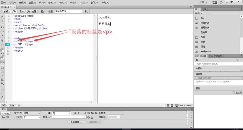 在設(shè)計視圖中輸入一段文字,然后點鍵盤上的ENTER鍵就可以創(chuàng)建一個段落。段落的標(biāo)簽是<p>,直接在<p>和</p>之間輸入文字,也可創(chuàng)建一個段落。