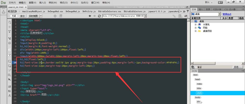 6、最后添加h1和h2的屬性值,如圖所示,這樣一個簡單的搜索框就出來了。