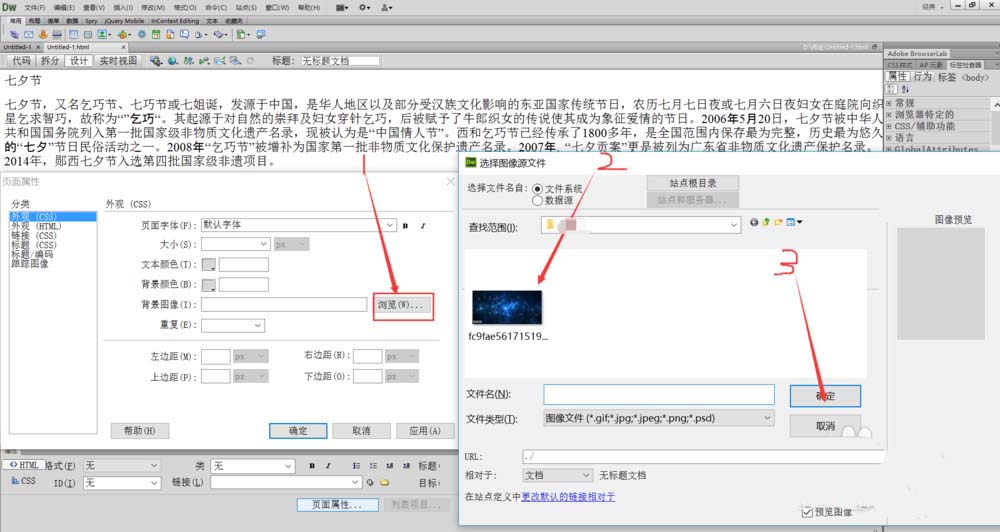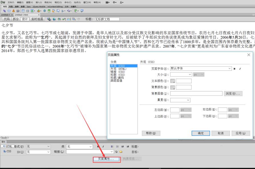 2、輸入完文本之后在最下面的屬性面板中大家可以看到有“頁面屬性”選項框,點擊打開,然后在彈出的對話框中“背景圖像”欄選擇需要的文本背景圖片即可。