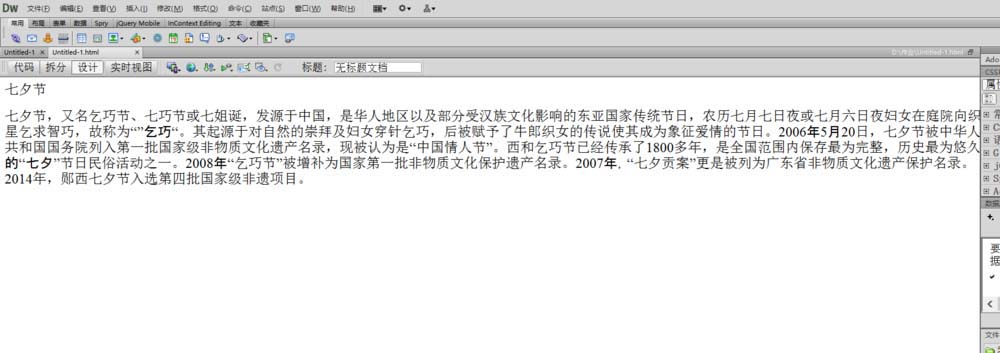 1、首先,打開Dreamweaver,新建html文件,然后輸入文本內容。