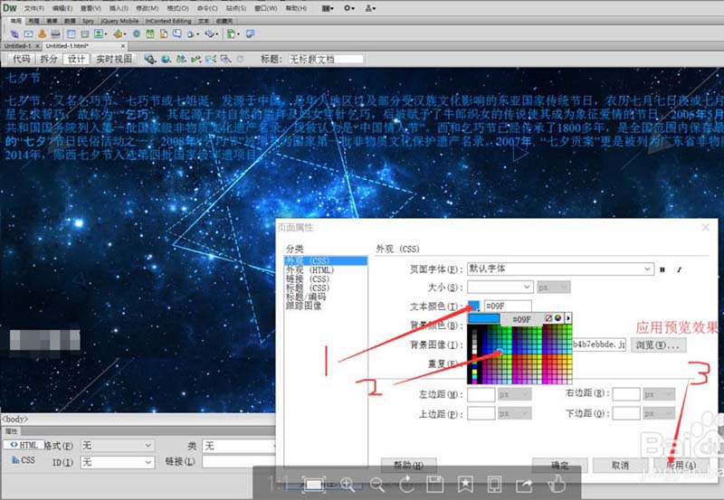 3、在插入背景圖片之后,有時應為背景顏色太深覆蓋了文本的顏色,這時我們可以根據情況繼續在“頁面屬性”中編輯字體顏色和大小來適應網頁背景,從而使文本網頁達到最佳效果。