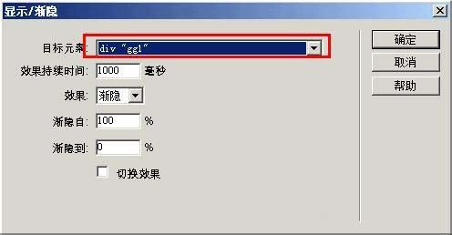 5、在打開的對話框中,將目標元素設置為gg1,效果是漸隱,點擊確定按鈕,這樣點擊圖中的x就能關閉廣告。