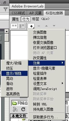 4、切換到行為面板,依次執行:添加---效果----顯示漸隱