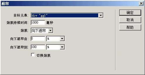 7、在動作面板添加一個遮簾效果,將目標元素設置為gg1,也就是剛才我們建立的電視廣告,然后點擊確定按鈕。