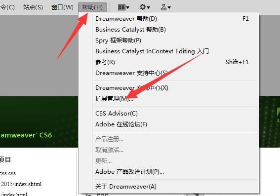 3、再然后打開Dreamweaver軟件,單擊菜單欄的幫助按鈕,在子菜單中選擇“擴展管理”選項。