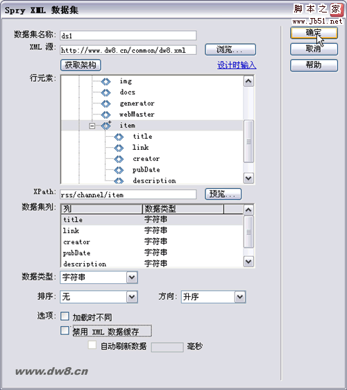 彈出【Spry XML 數(shù)據(jù)集】對(duì)話框,【XML源】可以是本地目錄下的XML數(shù)據(jù),也可以是跨域的遠(yuǎn)程XML數(shù)據(jù)。