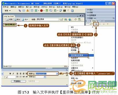 ( 1 )輸入文字并設(shè)置超鏈接。在網(wǎng)頁中輸入文字,因為單獨(dú)的文本文字是無法添加行為的,按照 Dreamweaver 中的約定,將文字的超鏈接設(shè)置為“ javascript:; ”才能夠添加行為。所以將文字的超鏈接設(shè)為“ javascript:; ”,并執(zhí)行【顯示彈出式菜單】行為,如圖 17-3 所示。