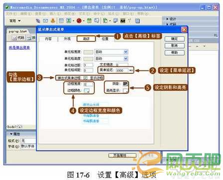 ( 4 )設(shè)置【高級】標(biāo)簽。在【高級】標(biāo)簽選項中設(shè)置菜單的延遲時間,以及是否顯示菜單邊框。然后設(shè)置邊框的寬度、顏色、陰影、高亮,如圖 17-6 所示。