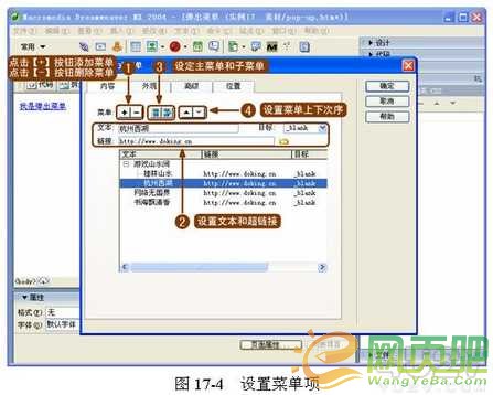 ( 2 )設(shè)置菜單項和子菜單項,并為菜單設(shè)置超鏈接,然后安排好各個菜單的次序,如圖 17-4 所示。