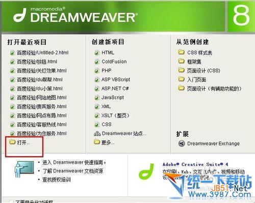 4、打開(kāi)你的dw,然后點(diǎn)擊打開(kāi)。