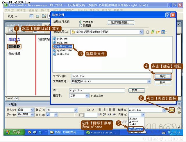 先建立兩個頁面,分別為“ myphoto.htm ”、“ mydiary.htm ”。前一個是相冊頁面,后一個是日記頁面。再建立一個含有框架的頁面,并添加導航欄。