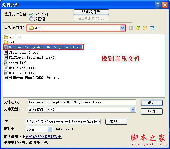 4、你可以將音樂文件放如你已經(jīng)創(chuàng)建好的站點(diǎn)中,選擇你要插入的音樂文件,點(diǎn)擊“確定”(如圖5所示)。彈出提示窗口后同樣選擇“確定”(如圖6所示)。