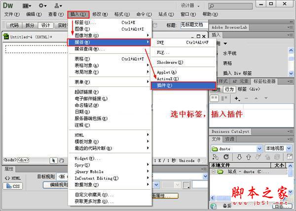 3、刪除div標(biāo)簽中的文字內(nèi)容,再次進(jìn)行:插入—媒體—插件操作。