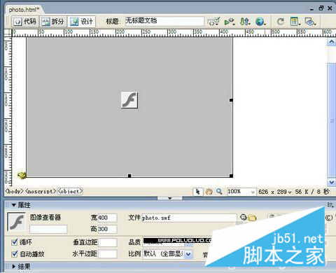 現(xiàn)在一個Flash元素就被插入網(wǎng)頁中了,為滿足實際需要,下面我們需要進(jìn)行簡單的參數(shù)設(shè)置。鼠標(biāo)點擊編輯窗口中的“Flash元素”,在屬性面板中重新設(shè)置動畫的寬、高值為實際所需,如圖2。