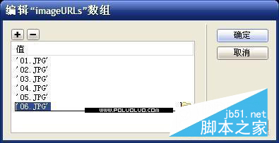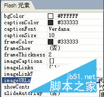 imageURLs,該值用于設(shè)置調(diào)用的圖片位置,我們一般將調(diào)用的圖片放在同保存的“Photo.swf”文件同一文件夾為佳。鼠標(biāo)點擊imageURLs項目的值,系統(tǒng)自動在參數(shù)右側(cè)增加“編輯數(shù)組值”按鈕,點擊進(jìn)入,如圖4。