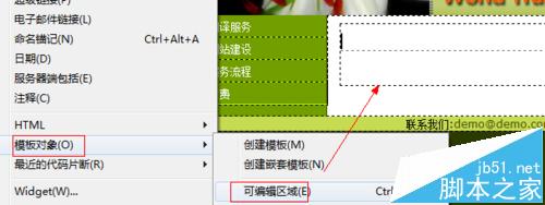 4、將鼠標光標定位到需要插入編輯區域的地方,然后在菜單欄中打開【插入】——【模板對象】——【可編輯區域】