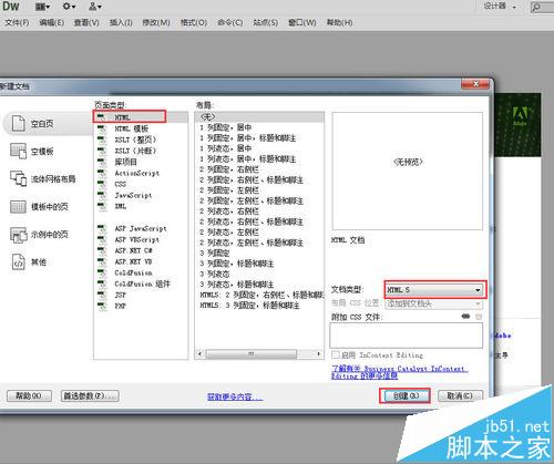 1、新建html頁面。打開Dreamweaver軟件,點擊菜單欄上的“文件”——“新建”(或者按Ctrl+n),在彈出新建文檔對話框中選擇文件類型為 html,文檔類型為 HTML5,然后點擊“創建”按鈕。