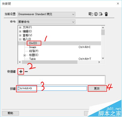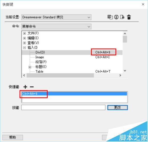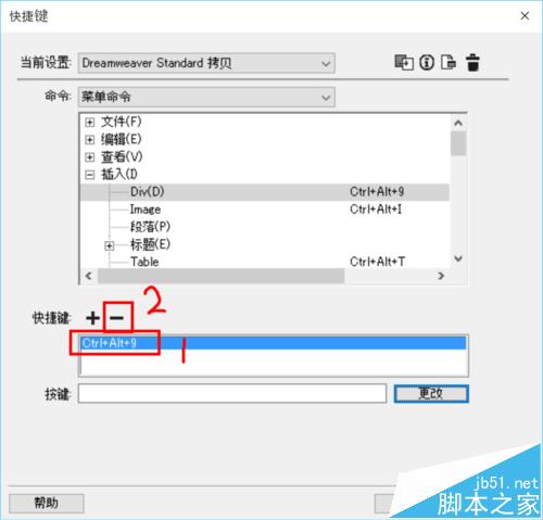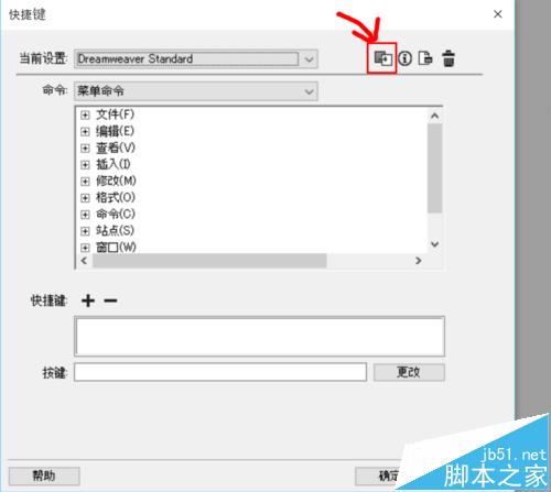2、在當前設置顯示【Dreamweaver Standard拷貝】(或者取好自己喜歡的名字也可)時,依然點擊【想修改的操作名稱】→【+】→【用鍵盤操作喜歡的快捷鍵】→【更改】。