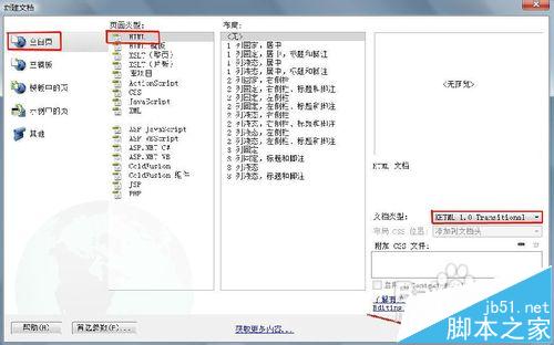 3、在新建文檔窗口,選擇“空白頁”—“HTML”,文檔類型選擇“XHTML1.0 transitional”,單擊“創建”按鈕。